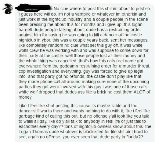 So, recently Logan South made threats, incited threats, and generally made an ass of himself on Facebook, per usual. Here’s the latest to come out about ‘ol Tommy Pickles a.k.a. Thomas Henry Barnett IV; mystery plots against people, accusations of assault (I assume biting could get someone an assault charge), and just all-around pathetic shit-talking.